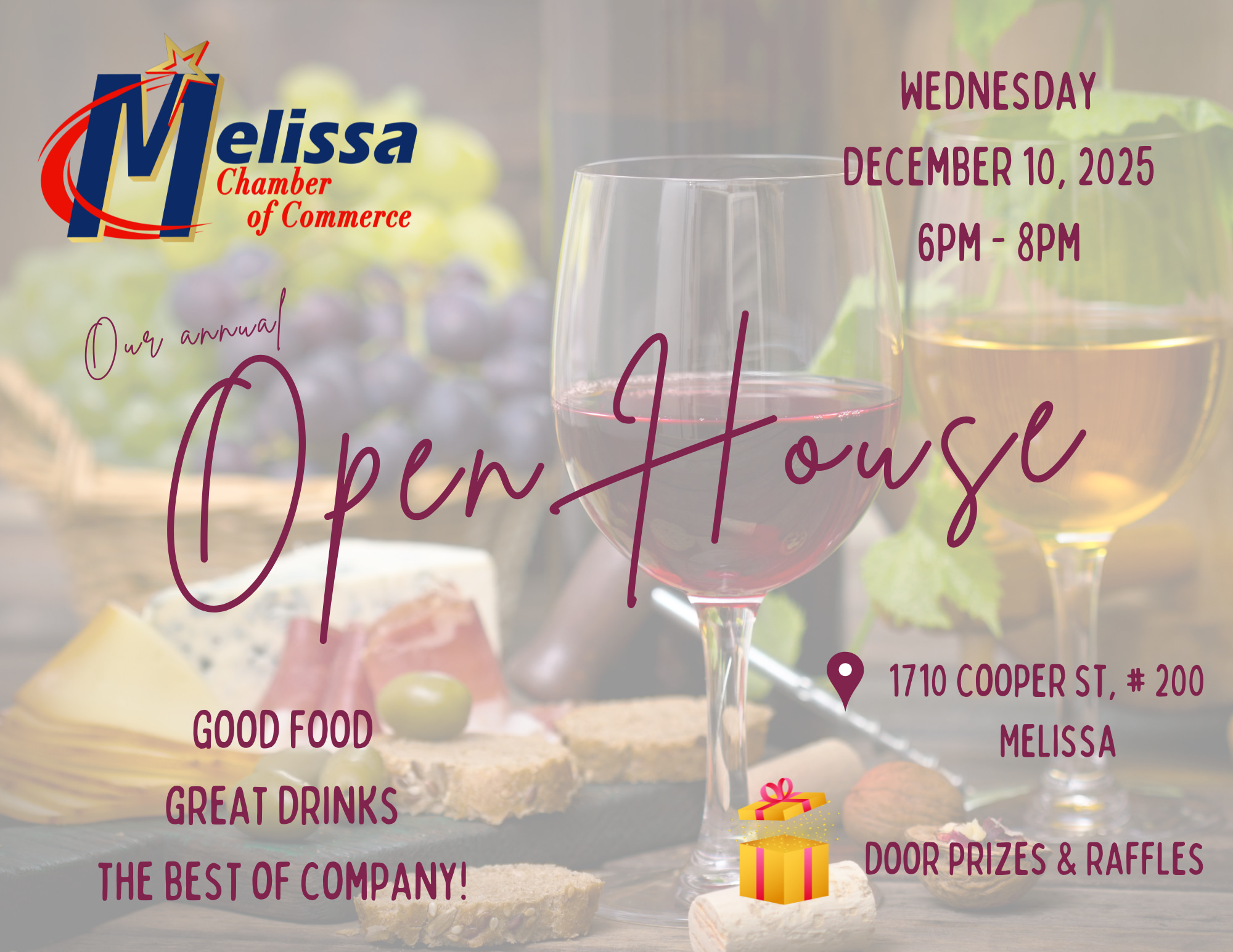 We are once again looking forward to hosting you at our now 4th annual, Chamber Open House - a come and go event not to be missed! Join us between 6pm 8pm for great food, great drinks and THE Best of Company as we celebrate closing out a successful year! Please RSVP before Dec., 6th by registering on our website for catering purposes. If you would like to contribute towards a door prize or gift basket for raffling, please email Shannon @ melissachamberchair@gmail.com or text us (972) 837-4277Images