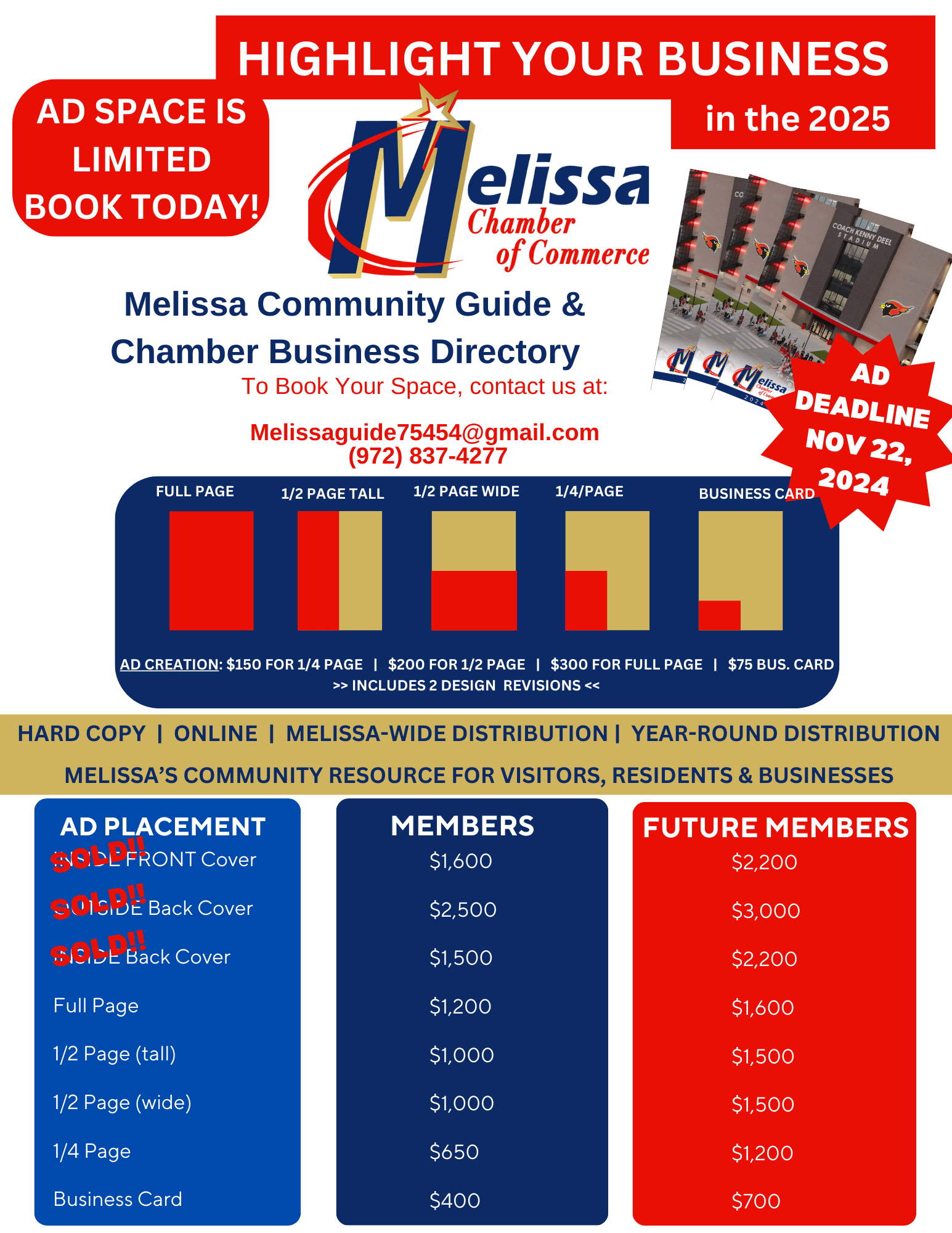 A fantastic resource all about Melissa and all we have to offer living here, visiting here and investing your business here! With its widespread distribution in both hard copy and online, your Melissa Community Guide Book provides a year round opportunity to highlight your business to not only our local community, but communities around Melissa and to those looking to move to Melissa. The 2025 Melissa Community Guide Book will be distributed to all businesses around town to share, at all of our ISD campuses and the ISD Home Office, HOA's, new builders, real estate agents, at events and to anyone who requests it. Don't miss this incredible opportunity to advertise your business or charity. Ad spots are already selling fast so don't wait - expected delivery will be in January 2025.