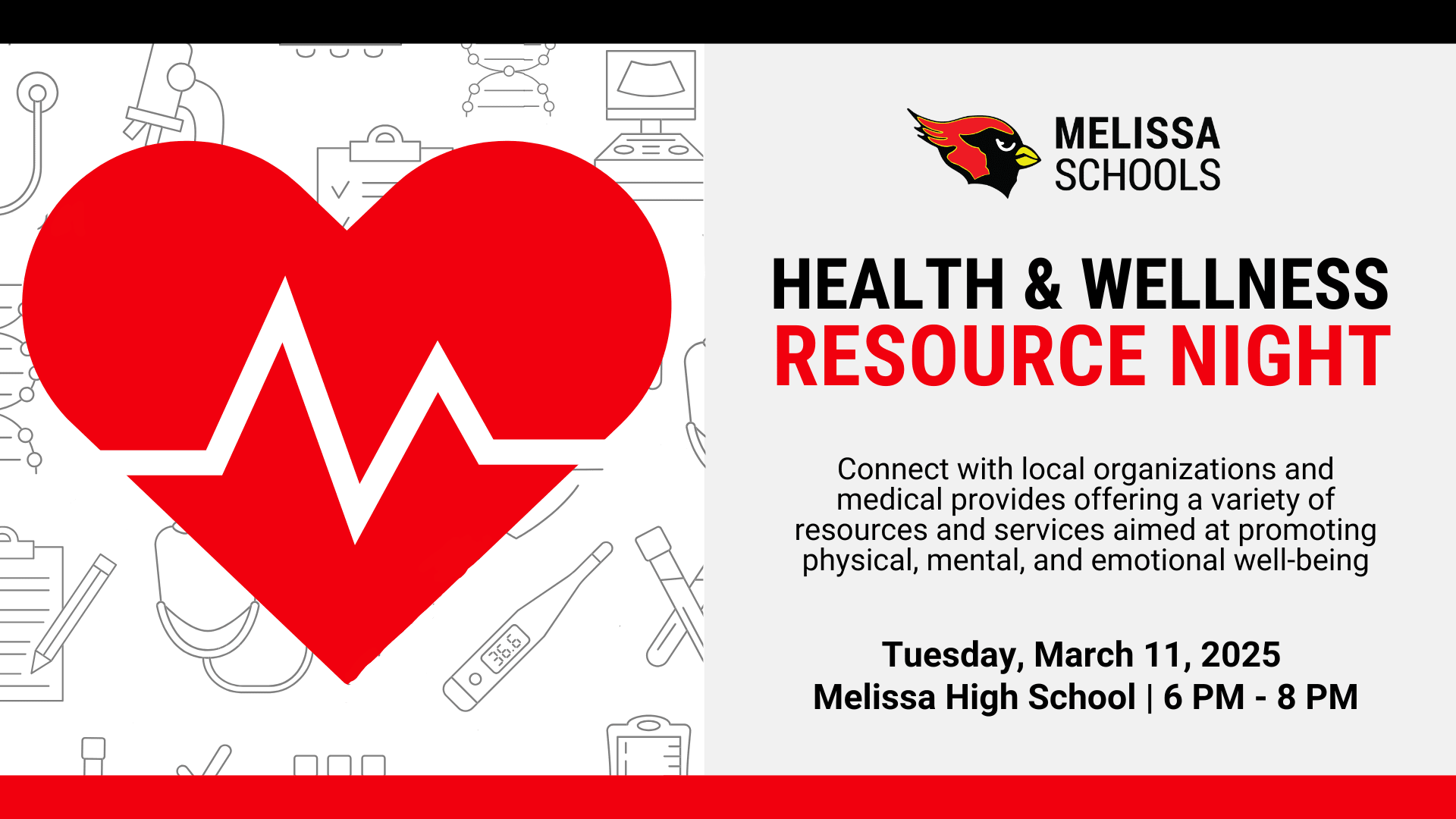 We are excited to announce that Melissa ISD will host their 1st Annual Health and Wellness Resource Night on Tuesday, March 11th, from 6:00 to 8:00 PM at Melissa High School, and they have invited the Melissa Chamber to participate. This event is designed to connect our community with a variety of resources and services that promote physical, mental, and emotional well-being. We aim to raise awareness of the invaluable community support systems available to our students, families, and staff. We would love for your organization to join and showcase the services you offer. This is a wonderful opportunity to build meaningful connections and share how your organization supports health and wellness within the Melissa ISD community. Limited resource spaces will be offered by the ISD. This event is by invitation only from the Melissa ISD.